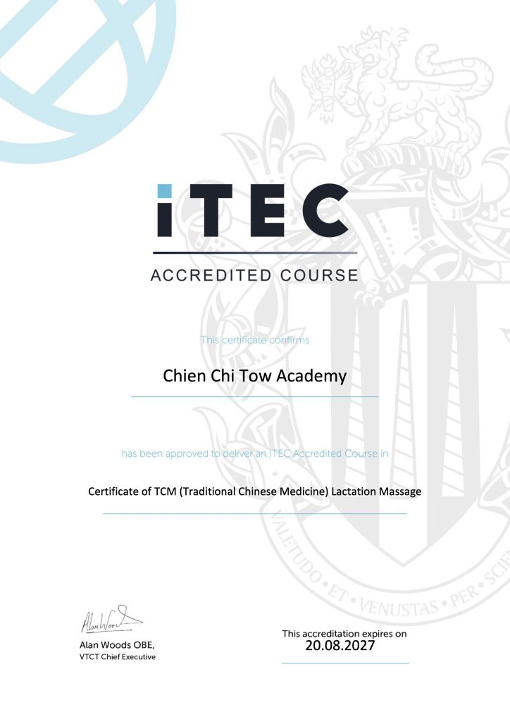 Our 3-day Certificate of TCM Lactation Massage Therapy course has undergone a thorough audit by iTEC and is now officially accredited, making it the first of its kind available in Singapore. Holding an iTEC-accredited certificate demonstrates that the individual has gained the essential skills and knowledge recognized by the industry, enhancing professional credibility and career opportunities.
